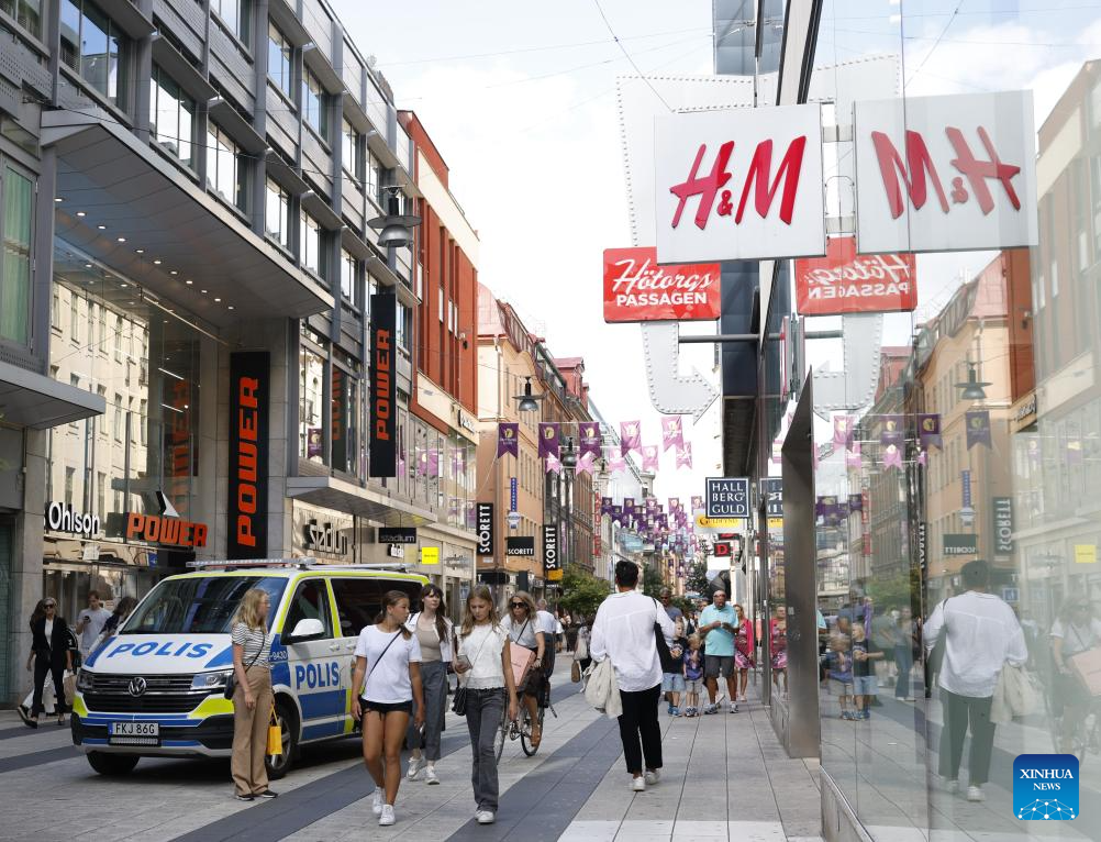 A police car is seen among pedestrians in central Stockholm, capital of Sweden, Aug. 17, 2023. The terrorist threat level in Sweden has been raised from "elevated" to "high," the Swedish Security Service (SAPO) said on Thursday. (Photo by Wei Xuechao/Xinhua)