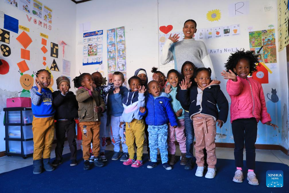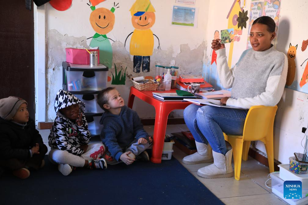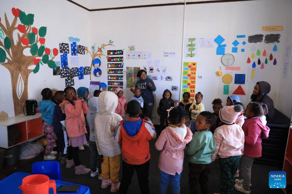 A teacher gives lessons to children at an early learning center in De Aar Town, more than 750 kilometers northeast of Cape Town, South Africa, on Aug. 11, 2023. This early learning center was funded by Longyuan South Africa Renewables of China Longyuan Power Group Corporation Limited, which has funded the establishment of four early learning centers in De Aar to provide education for children from poor families. Nearly 500 children in need have been admitted to these learning centers so far. (Xinhua/Dong Jianghui)