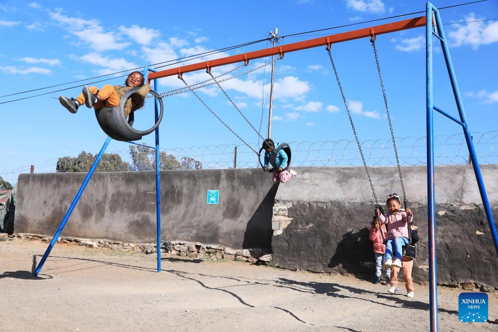 Children play on swings at an early learning center in De Aar Town, more than 750 kilometers northeast of Cape Town, South Africa, on Aug. 11, 2023. This early learning center was funded by Longyuan South Africa Renewables of China Longyuan Power Group Corporation Limited, which has funded the establishment of four early learning centers in De Aar to provide education for children from poor families. Nearly 500 children in need have been admitted to these learning centers so far. (Xinhua/Dong Jianghui)