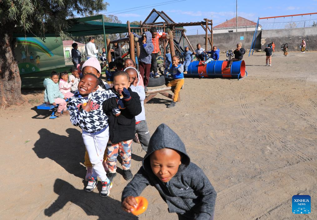 Children play at an early learning center in De Aar Town, more than 750 kilometers northeast of Cape Town, South Africa, on Aug. 11, 2023. This early learning center was funded by Longyuan South Africa Renewables of China Longyuan Power Group Corporation Limited, which has funded the establishment of four early learning centers in De Aar to provide education for children from poor families. Nearly 500 children in need have been admitted to these learning centers so far. (Xinhua/Dong Jianghui)