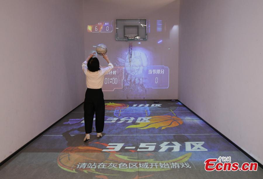 A visitor experiences an interactive holographic projection basketball training equipment at the Hangzhou Asian Games Museum in east China's Zhejiang Province, Aug. 17, 2023. (Photo: China News Service/Wang Gang)