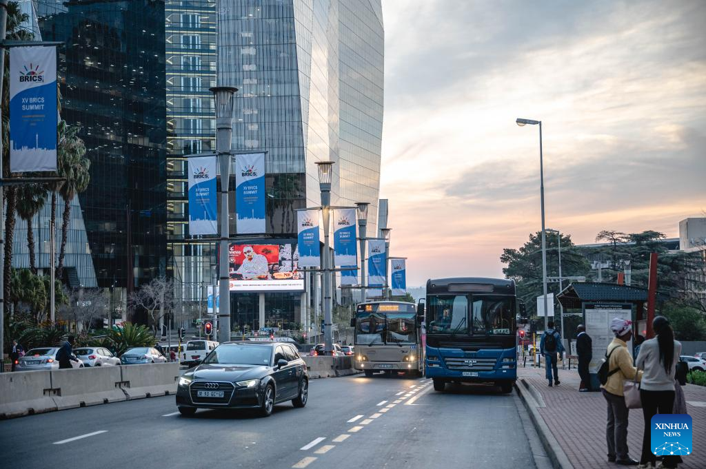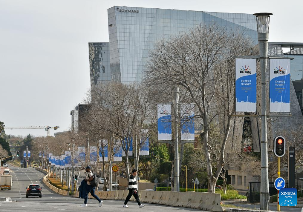 Signboards of the 15th BRICS summit are seen in a street of Johannesburg, South Africa, Aug. 17, 2023. The 15th BRICS summit is to be held in Johannesburg, South Africa, on Aug. 22-24. (Xinhua/Chen Cheng)