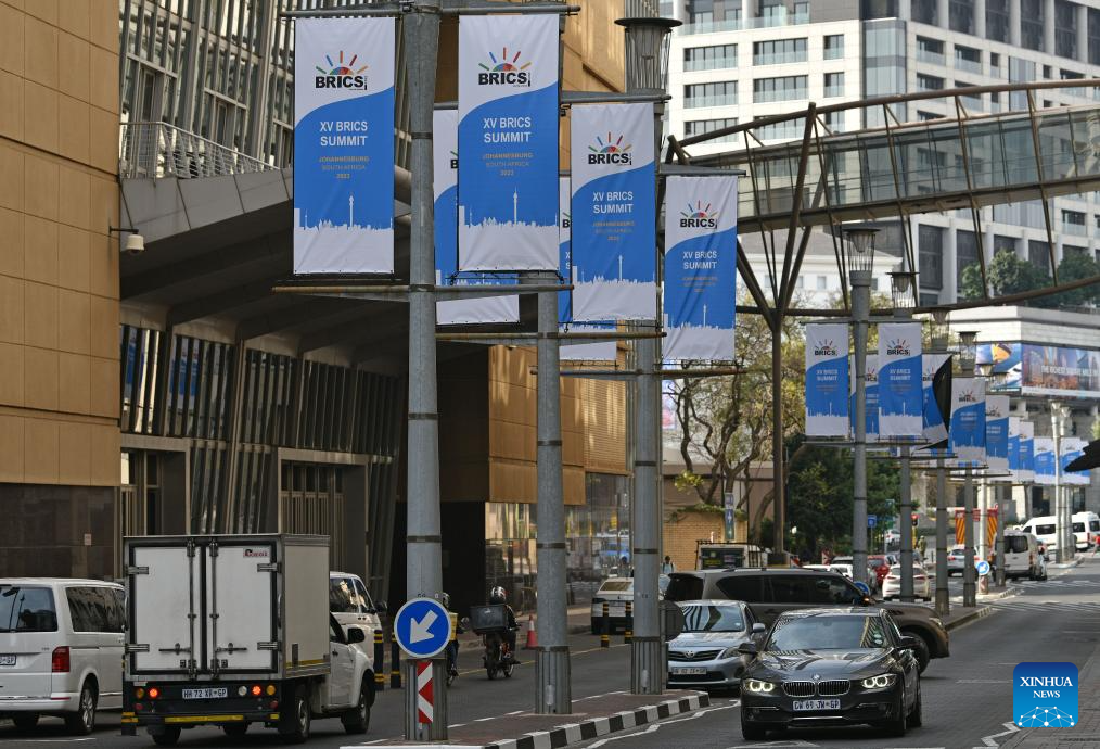 Signboards of the 15th BRICS summit are seen in a street of Johannesburg, South Africa, Aug. 17, 2023. The 15th BRICS summit is to be held in Johannesburg, South Africa, on Aug. 22-24. (Xinhua/Wang Guansen)