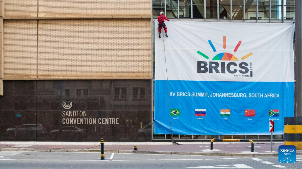 A worker arranges a signboard of the 15th BRICS summit outside the Sandton Convention Center in Johannesburg, South Africa, Aug. 17, 2023. The 15th BRICS summit is to be held in Johannesburg, South Africa, on Aug. 22-24. (Xinhua/Zhang Yudong)
