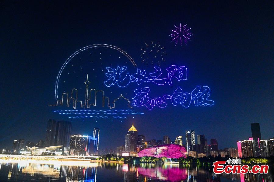 Drones fly in formation to create different images above Hunhe River in Shenyang, northeast China's Liaoning Province, Aug. 17, 2023. (Photo: China News Service/Yu Haiyang)