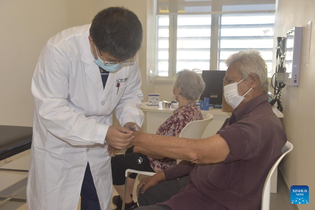 A doctor of a Chinese medical team provides medical services for a patient at the Cambodia-China Friendship Preah Kossamak Hospital's Chinese Medicine Clinic in Phnom Penh, Cambodia, Aug. 18, 2023. (Xinhua/Wu Changwei)
