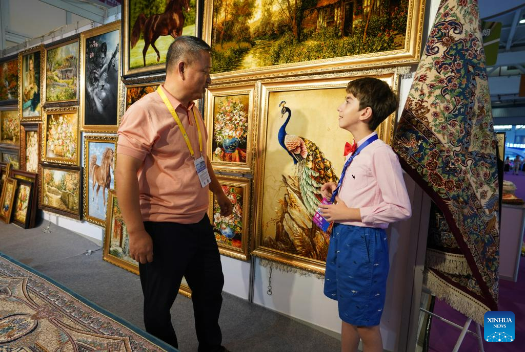 A boy from Iran introduces tapestry at the 7th China-South Asia Expo in Kunming, southwest China's Yunnan Province, Aug. 16, 2023. The ongoing seventh China-South Asia Expo has attracted more than 30,000 exhibitors, representatives, and guests from 85 countries and regions to attend online and offline. (Xinhua/Chen Xinbo)