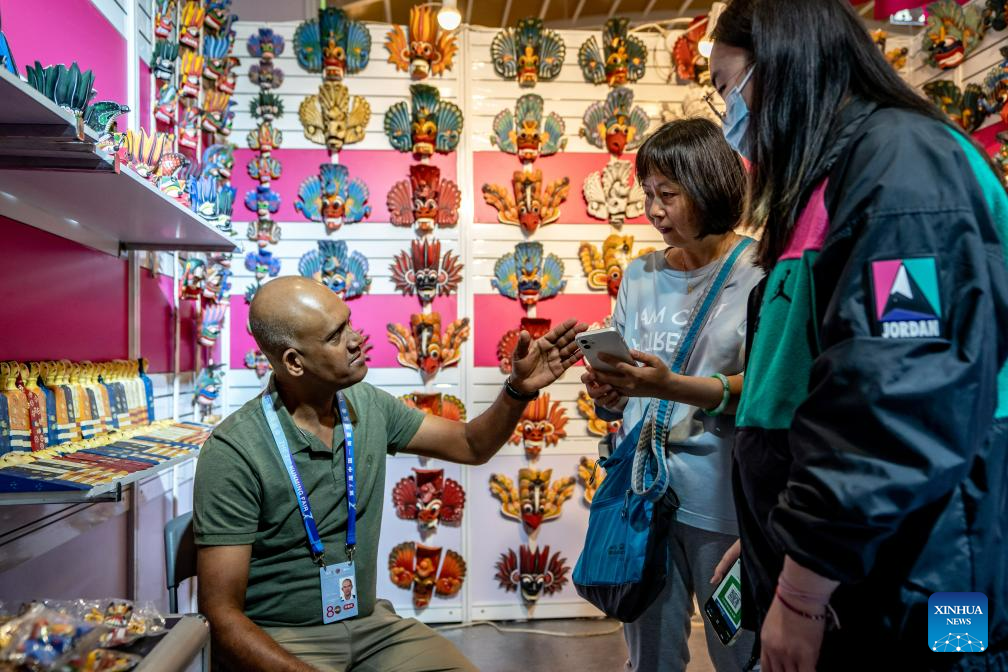 People select products at the booth of Sri Lanka at the 7th China-South Asia Expo in Kunming, southwest China's Yunnan Province, Aug. 18, 2023. The ongoing seventh China-South Asia Expo has attracted more than 30,000 exhibitors, representatives, and guests from 85 countries and regions to attend online and offline. (Xinhua/Hu Chao)