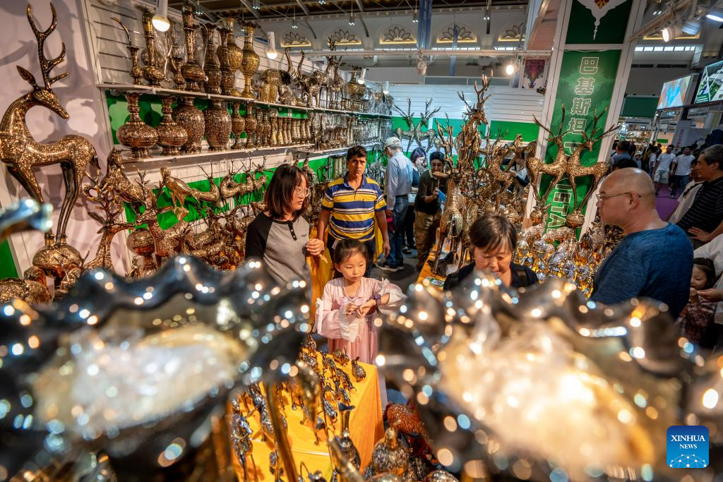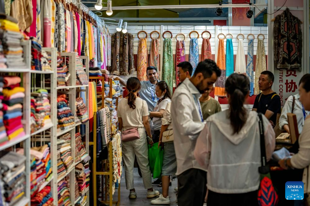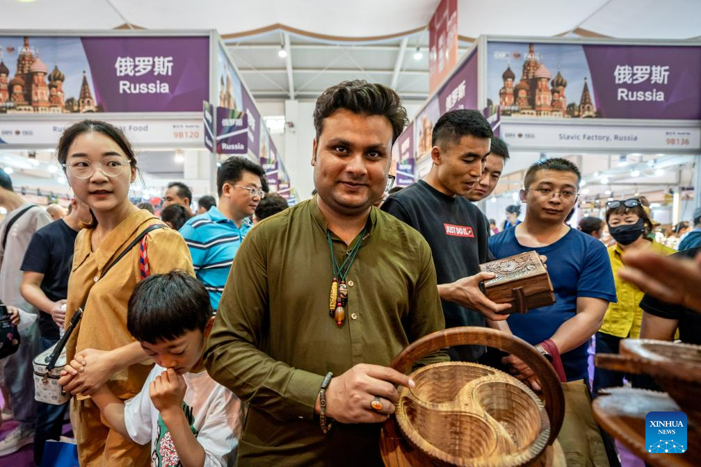 Visitors select products at the booth of Pakistan at the 7th China-South Asia Expo in Kunming, southwest China's Yunnan Province, Aug. 18, 2023. The ongoing seventh China-South Asia Expo has attracted more than 30,000 exhibitors, representatives, and guests from 85 countries and regions to attend online and offline. (Xinhua/Hu Chao)