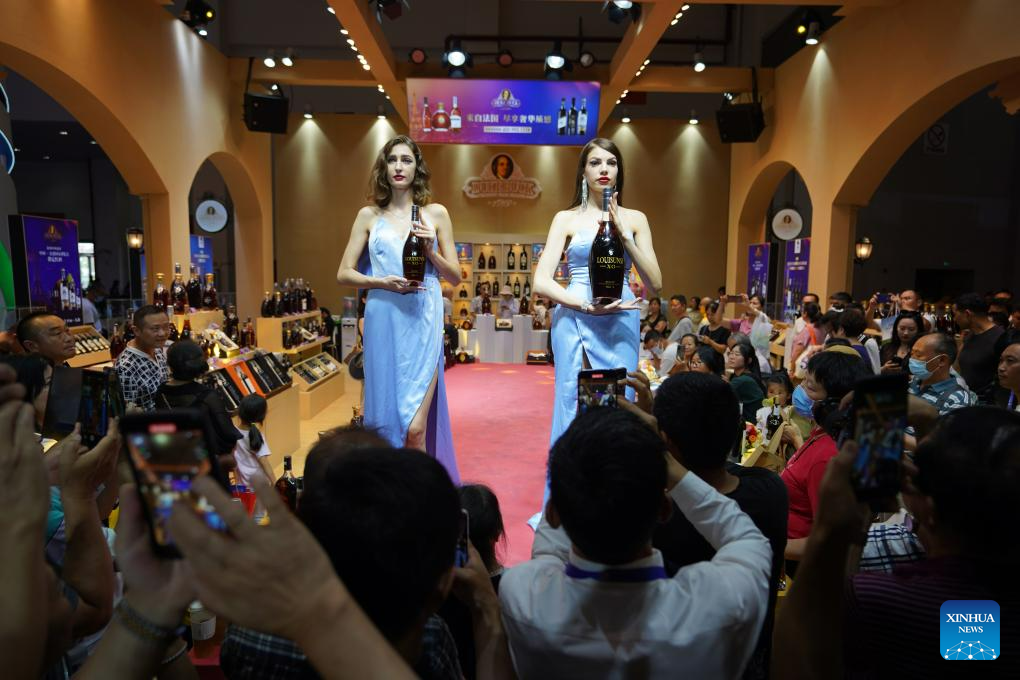 Models show brandy at the booth of France at the 7th China-South Asia Expo in Kunming, southwest China's Yunnan Province, Aug. 17, 2023. The ongoing seventh China-South Asia Expo has attracted more than 30,000 exhibitors, representatives, and guests from 85 countries and regions to attend online and offline. (Xinhua/Chen Xinbo)