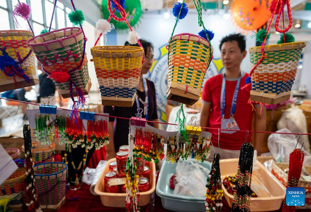 This photo taken on Aug. 18, 2023 shows bamboo products at the booth of Myanmar at the 7th China-South Asia Expo in Kunming, southwest China's Yunnan Province. The ongoing seventh China-South Asia Expo has attracted more than 30,000 exhibitors, representatives, and guests from 85 countries and regions to attend online and offline. (Xinhua/Chen Xinbo)