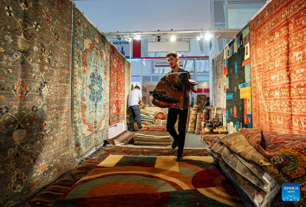 An exhibitor carries carpets at the booth of Afghanistan at the 7th China-South Asia Expo in Kunming, southwest China's Yunnan Province, Aug. 16, 2023. The ongoing seventh China-South Asia Expo has attracted more than 30,000 exhibitors, representatives, and guests from 85 countries and regions to attend online and offline. (Xinhua/Chen Xinbo)