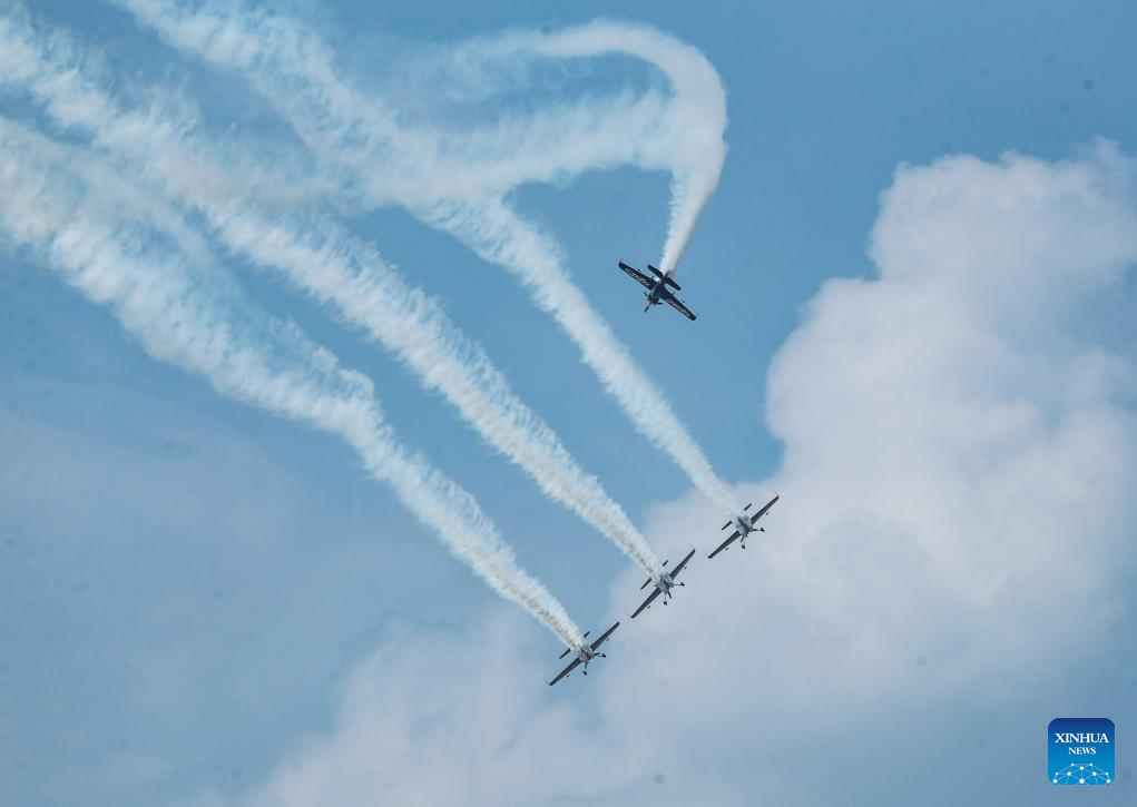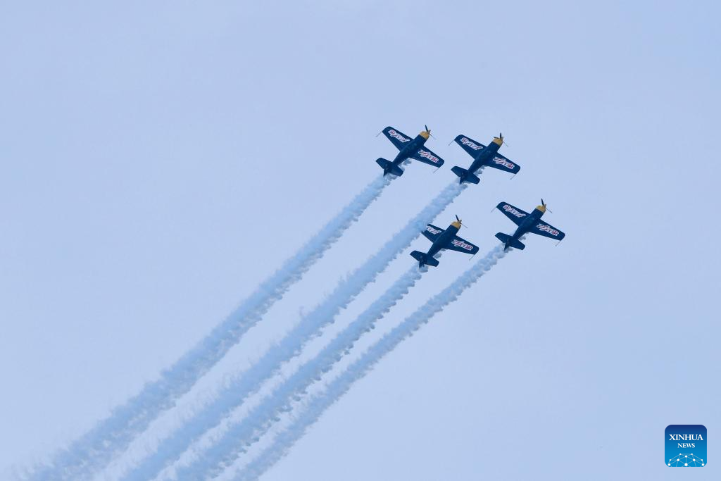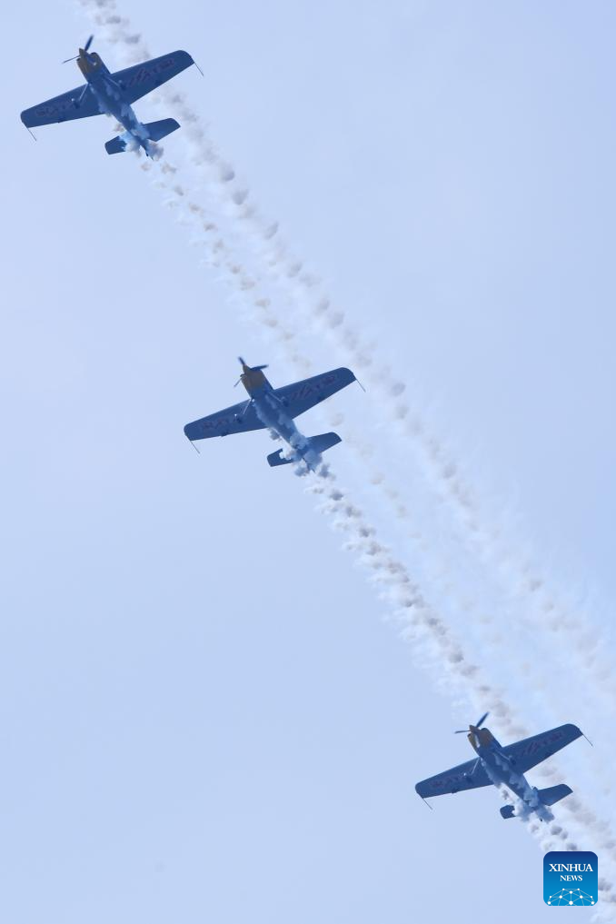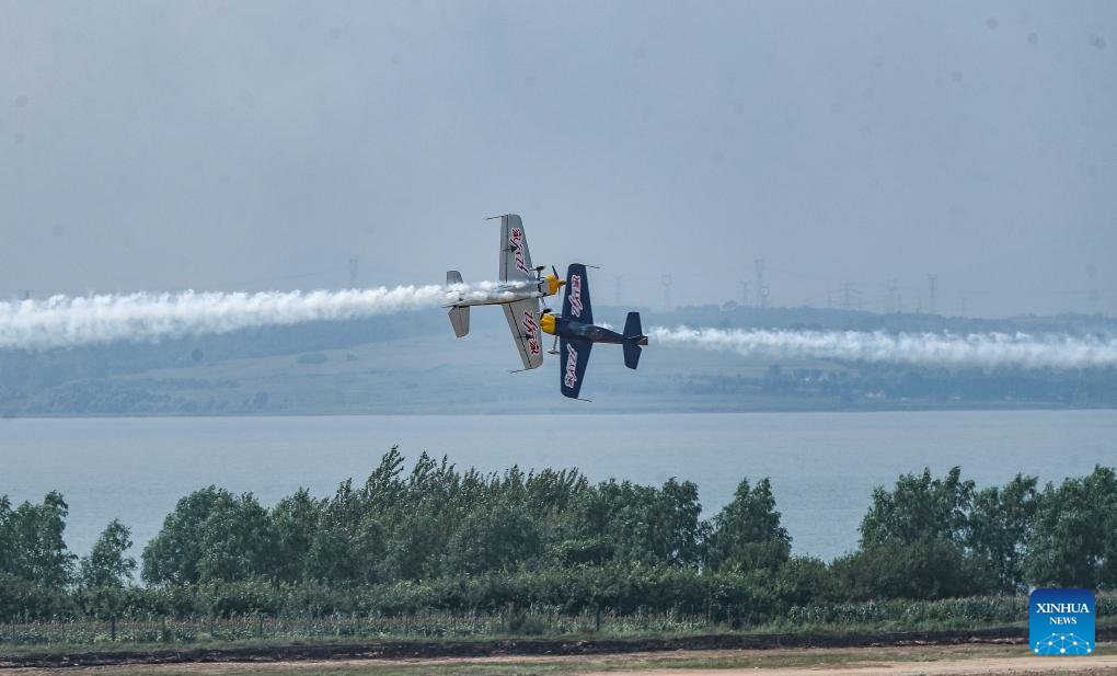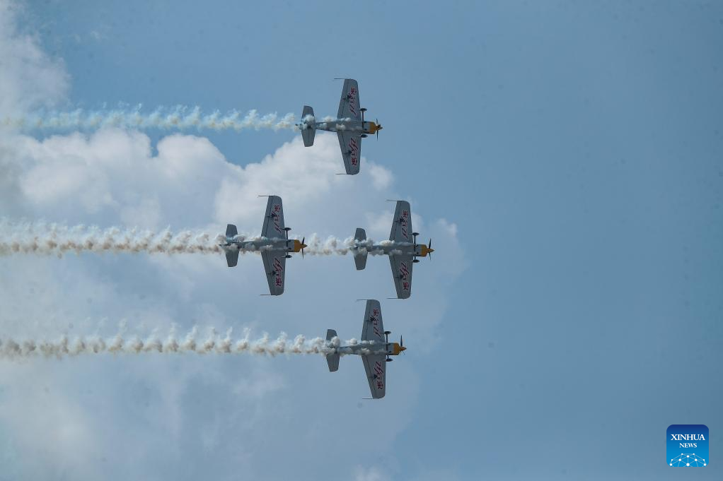 An aerobatic performance is staged during the opening ceremony of the 10th Faku Flight International Conference in Shenyang, northeast China's Liaoning Province, Aug. 18, 2023. (Xinhua/Long Lei)