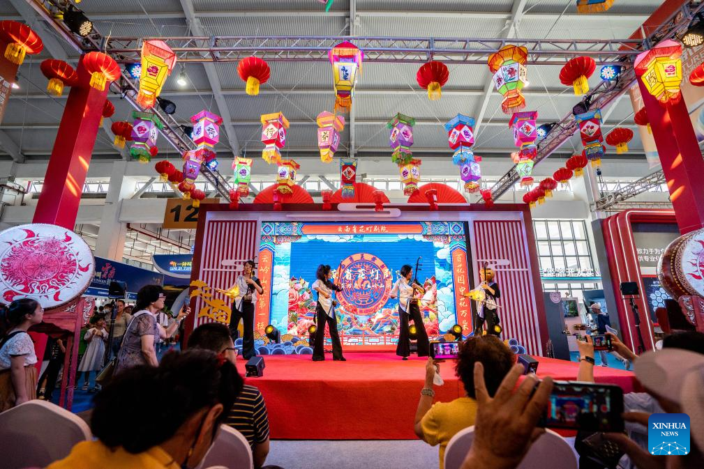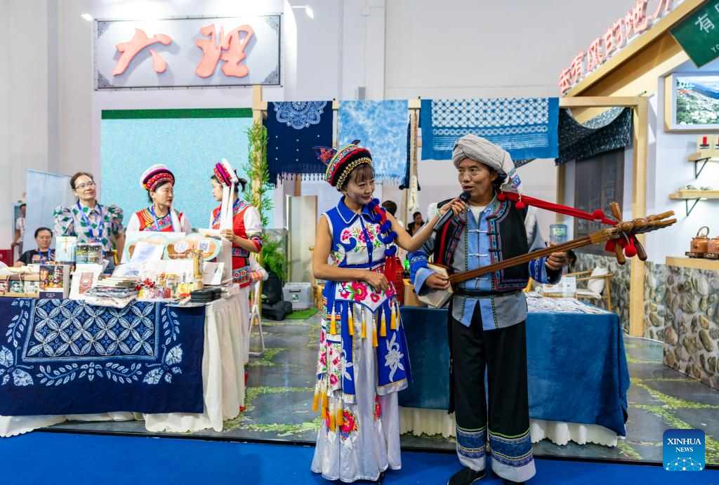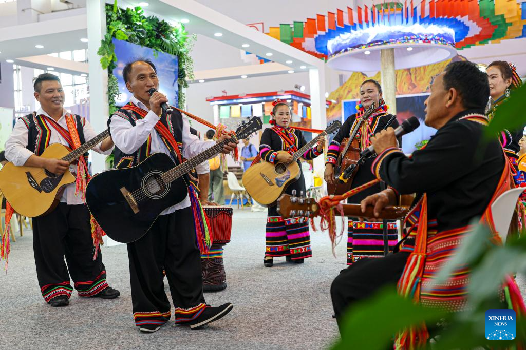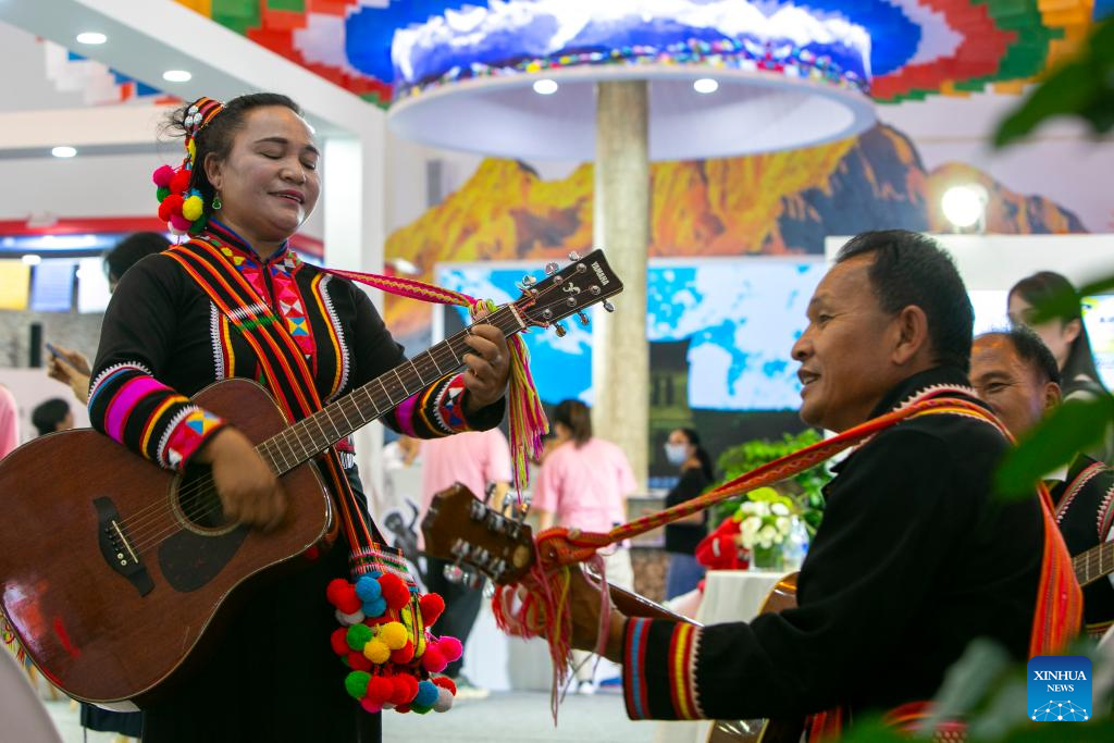 Inheritors of the intangible cultural heritage perform in the Culture and Tourism Pavilion at the seventh China-South Asia Expo in Kunming, southwest China's Yunnan Province, Aug. 16, 2023. The ongoing seventh China-South Asia Expo has attracted more than 30,000 exhibitors, representatives, and guests from 85 countries and regions to attend online and offline. (Xinhua/Chen Xinbo)