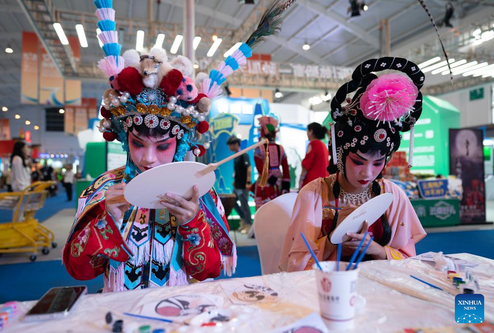 Artists draw opera masks at the booth of Dian Opera in the Culture and Tourism Pavilion at the seventh China-South Asia Expo in Kunming, southwest China's Yunnan Province, Aug. 16, 2023. The ongoing seventh China-South Asia Expo has attracted more than 30,000 exhibitors, representatives, and guests from 85 countries and regions to attend online and offline. (Xinhua/Chen Xinbo)