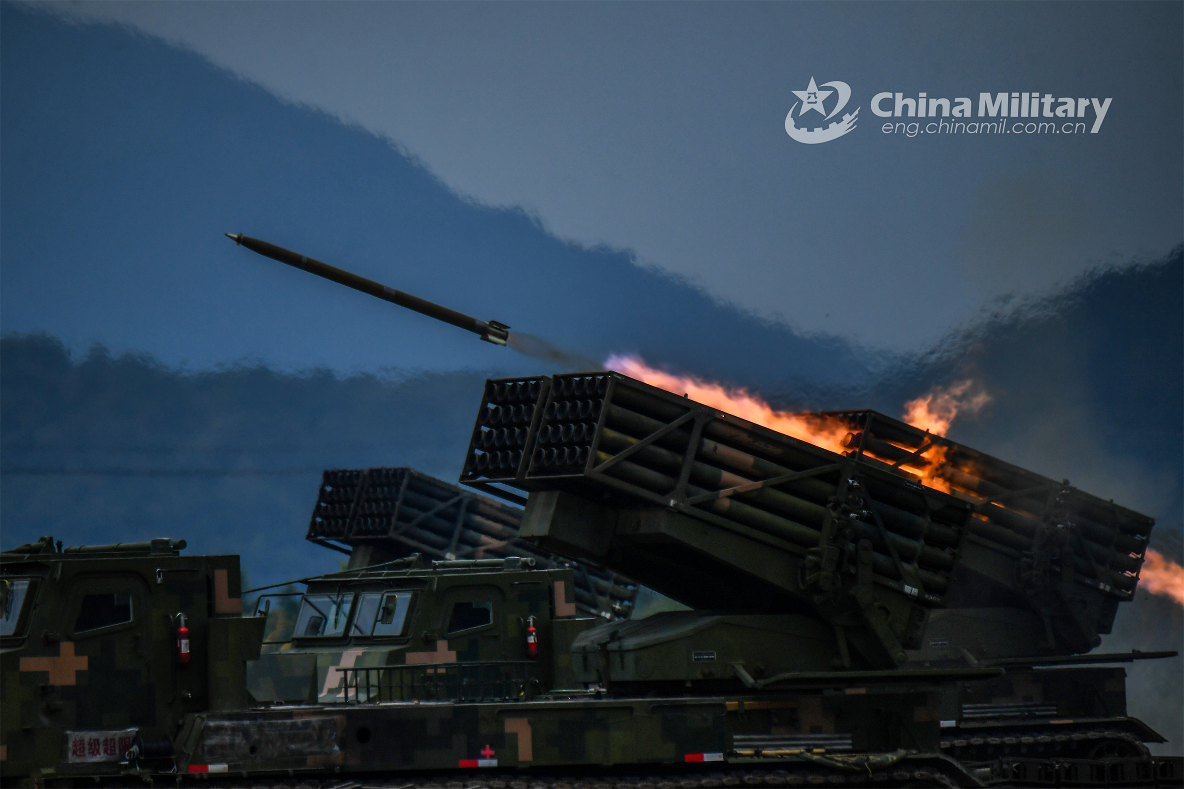 A vehicle-mounted multiple launch rocket system (MLRS) attached to an artillery element of an army brigade fires at mock target during a round-the-clock training exercise held in recent days. (eng.chinamil.com.cn/Photo by Liu Zhiyong)
