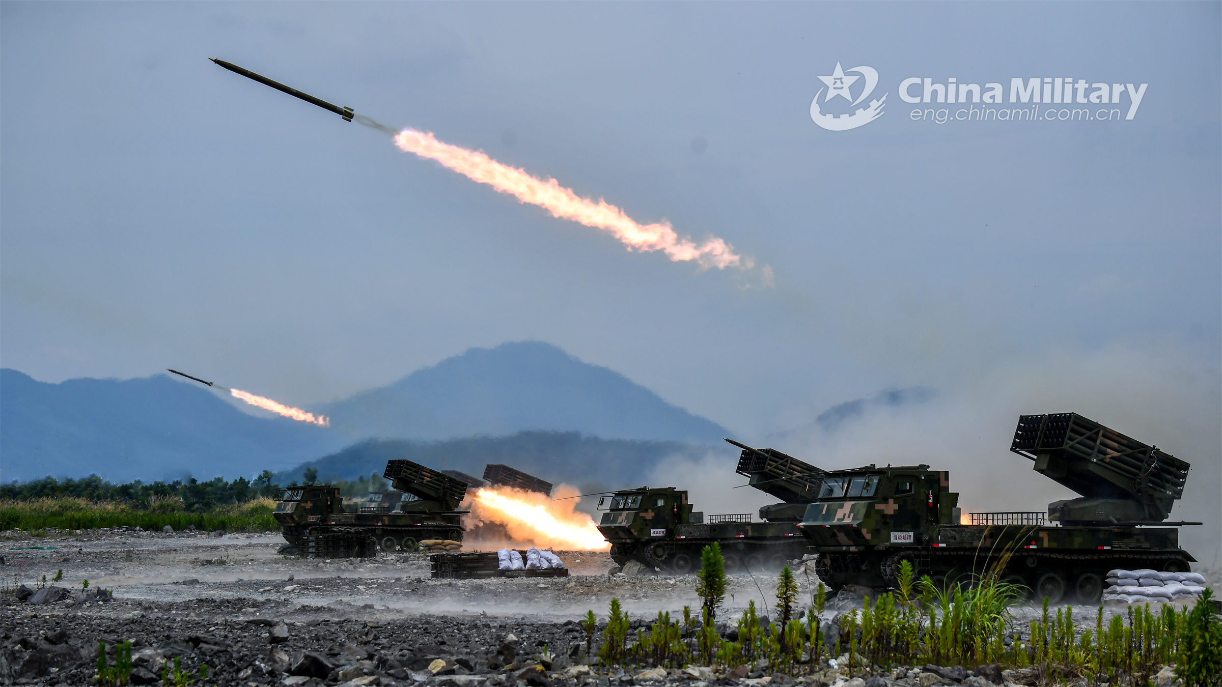 Vehicle-mounted multiple launch rocket systems attached to an artillery element of an army brigade fire at mock targets during a round-the-clock training exercise held in recent days. (eng.chinamil.com.cn/Photo by Liu Zhiyong)