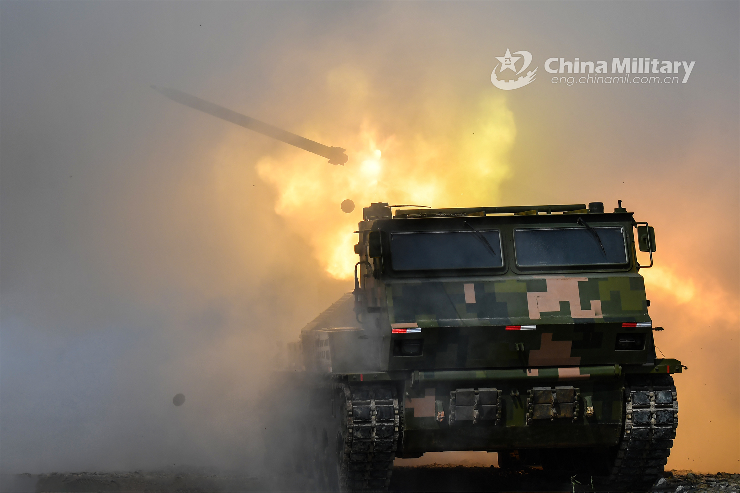 A vehicle-mounted multiple launch rocket system (MLRS) attached to an artillery element of an army brigade fires at mock target during a round-the-clock training exercise held in recent days. (eng.chinamil.com.cn/Photo by Liu Zhiyong)