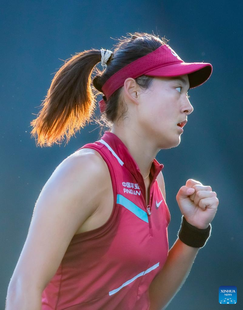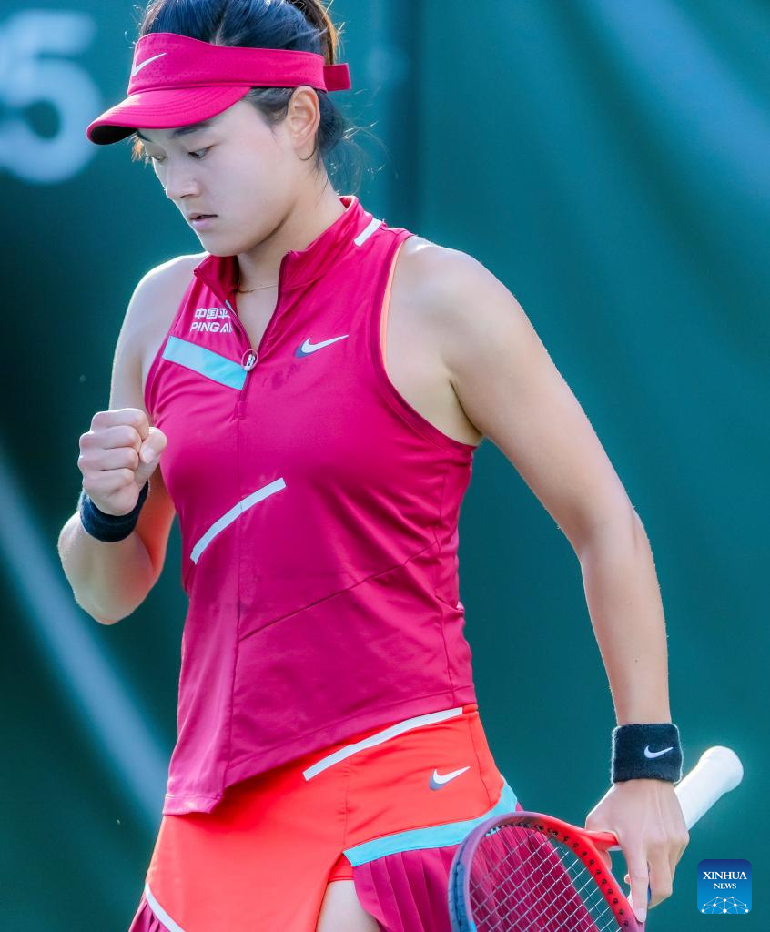 Wang Yafan celebrates scoring during the women's singles semifinal match between Wang Yafan of China and Uchijima Moyuka of Japan at the Golden Gate Open tennis tournament in San Francisco Bay Area, the United States, on Aug. 18, 2023. (Photo by Arthur Dong/Xinhua)