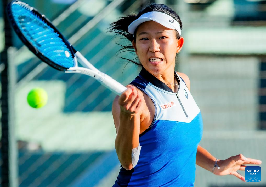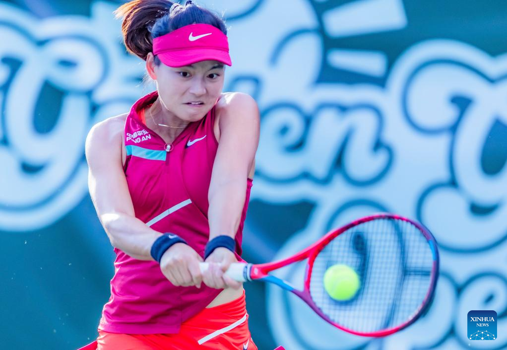 Wang Yafan hits a return during the women's singles semifinal match between Wang Yafan of China and Uchijima Moyuka of Japan at the Golden Gate Open tennis tournament in San Francisco Bay Area, the United States, on Aug. 18, 2023. (Photo by Arthur Dong/Xinhua)