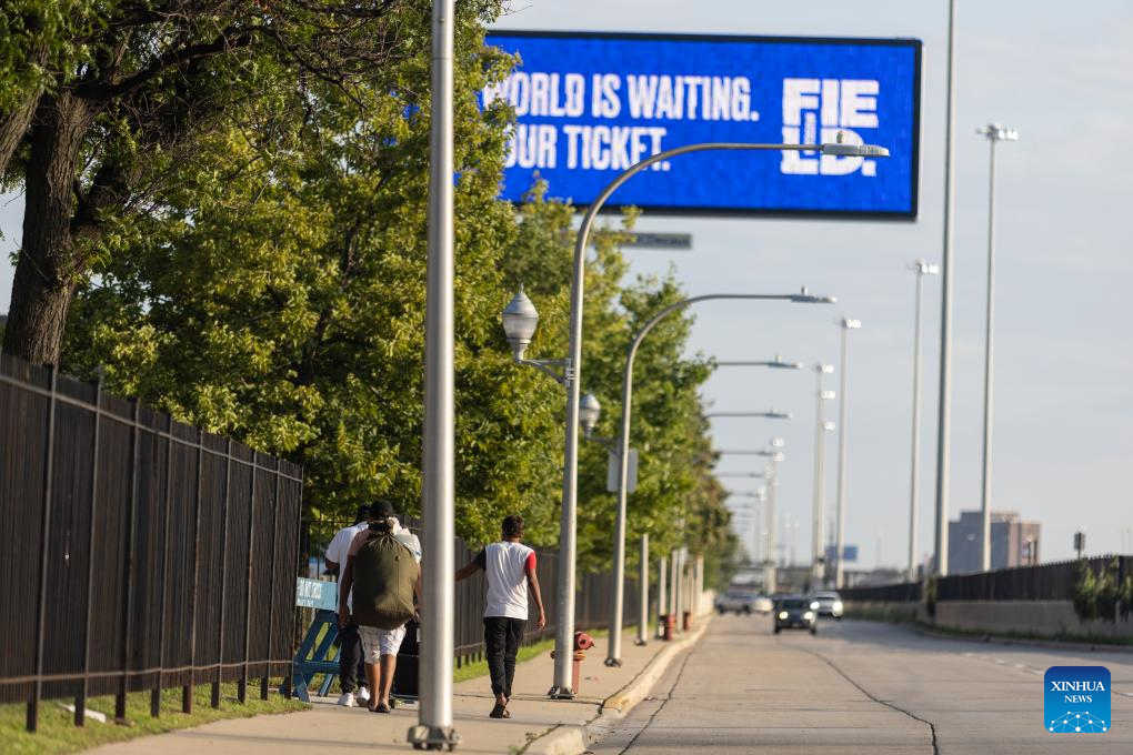 Migrants are seen outside the 2nd District Police Station in Chicago, the United States, Aug. 17, 2023. Since Aug. 31, 2022, the State of Texas has dispatched more than 13,000 migrants to Chicago, according to local media. (Photo by Vincent D. Johnson/Xinhua)