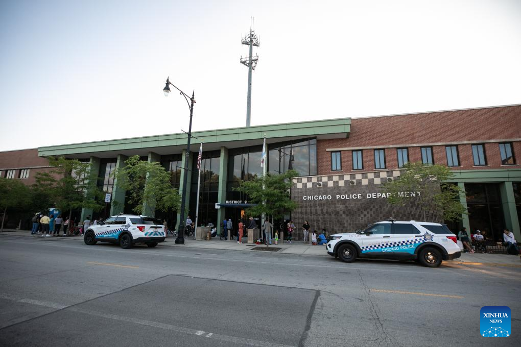 Migrants are seen outside the 9th District Police Station in Chicago, the United States, Aug. 17, 2023. Since Aug. 31, 2022, the State of Texas has dispatched more than 13,000 migrants to Chicago, according to local media. (Photo by Vincent D. Johnson/Xinhua)