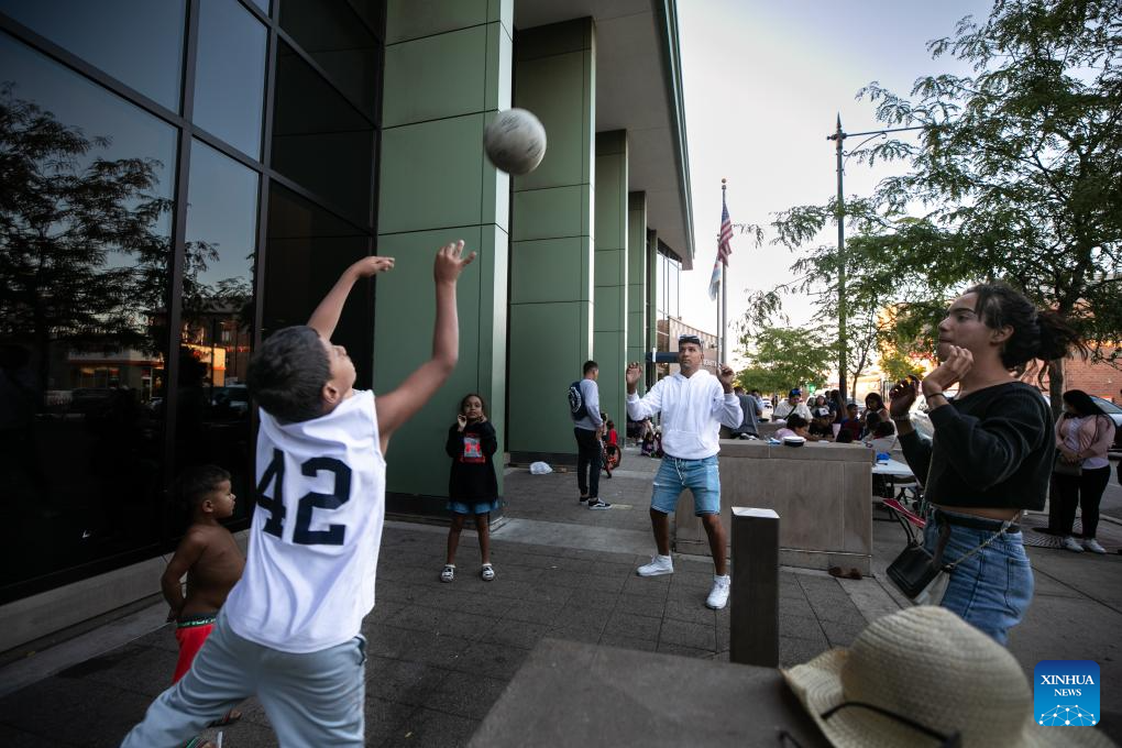 Migrants play volleyball outside the 9th District Police Station in Chicago, the United States, Aug. 17, 2023. Since Aug. 31, 2022, the State of Texas has dispatched more than 13,000 migrants to Chicago, according to local media. (Photo by Vincent D. Johnson/Xinhua)