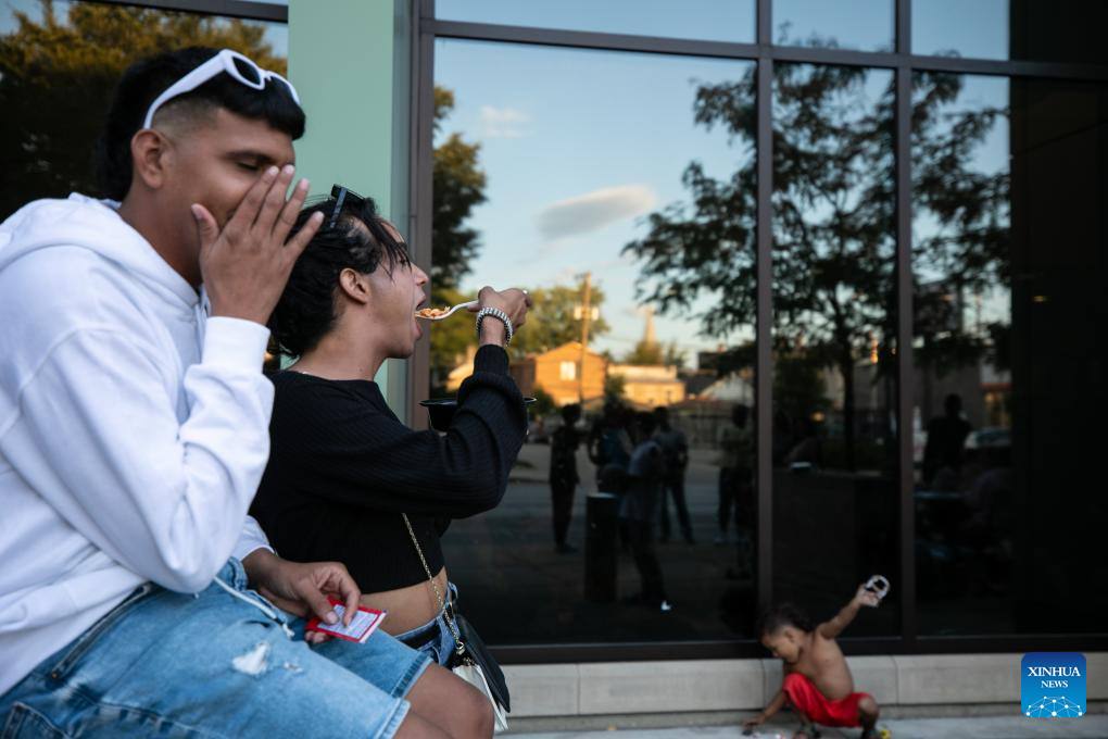 Migrants eat food outside the 9th District Police Station in Chicago, the United States, Aug. 17, 2023. Since Aug. 31, 2022, the State of Texas has dispatched more than 13,000 migrants to Chicago, according to local media. (Photo by Vincent D. Johnson/Xinhua)