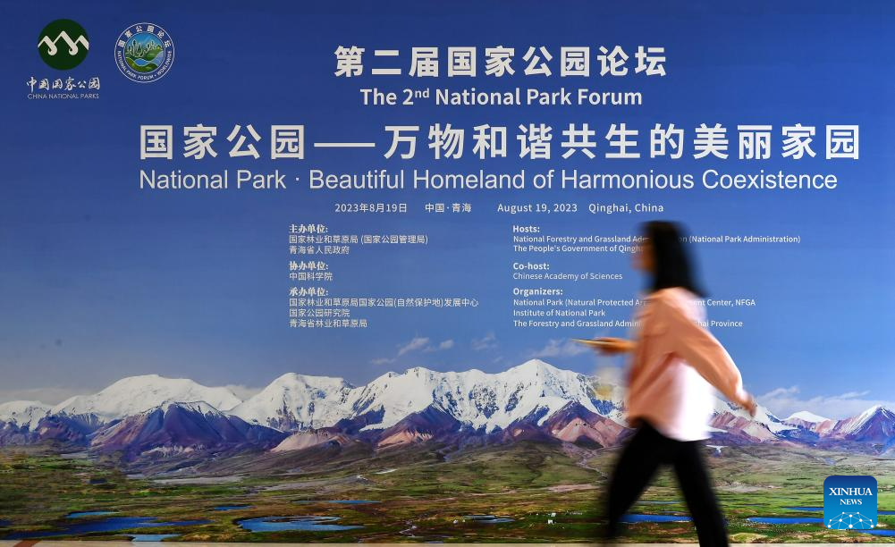 This photo shows the main forum of the second National Park Forum held in Xining, capital of northwest China's Qinghai Province, Aug. 19, 2023. Themed "National Park -- Beautiful Homeland of Harmonious Coexistence," the second National Park Forum was held here on Saturday. (Xinhua/Zhang Hongxiang)