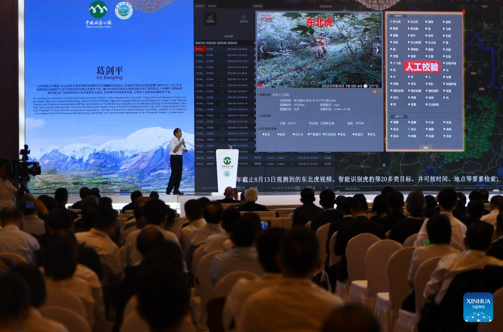 Ge Jianping, a professor at Beijing Normal University, speaks at the second National Park Forum held in Xining, capital of northwest China's Qinghai Province, Aug. 19, 2023. Themed "National Park -- Beautiful Homeland of Harmonious Coexistence," the second National Park Forum was held here on Saturday. (Xinhua/Zhang Hongxiang)