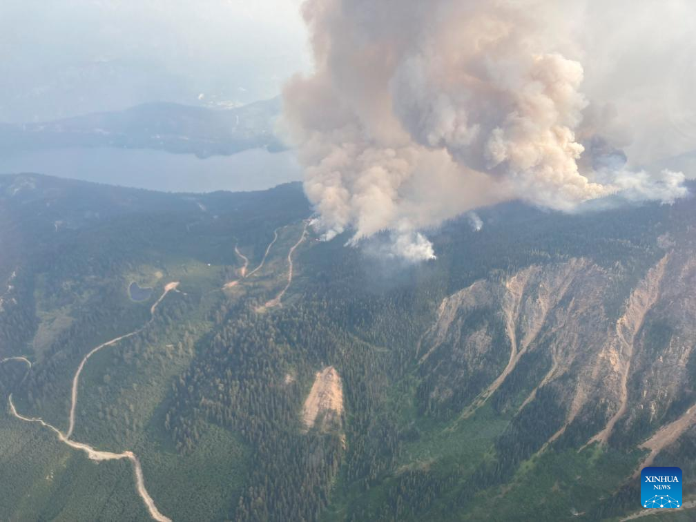 This aerial photo taken on Aug. 6, 2023 shows wildfires near Downton Lake, in the south-central part of British Columbia, Canada. Canada's British Columbia government said Saturday it will implement a restriction on non-essential travel to areas affected by wildfires amid its state of emergency. The government has declared a provincial state of emergency as thousands evacuated from their homes. (British Columbia Wildfire Service/Handout via Xinhua)
