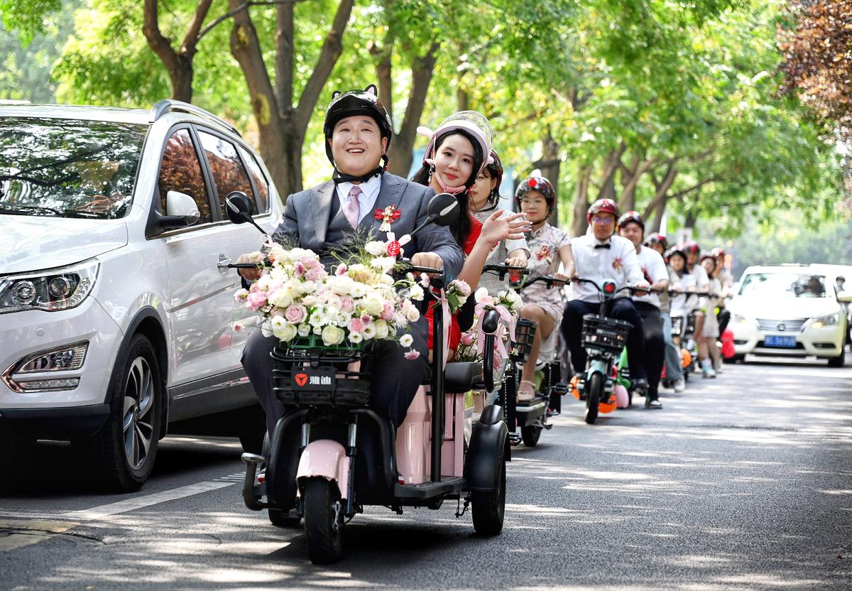 Zheng Chenglong, a resident of Luoyang city in central China's Henan Province, escorts his bride, Gao Mingze, to their wedding with a fleet of electric mopeds ridden by his family, relatives, and friends on Aug. 13, 2023. By picking up the bride in this low-carbon, simple, and romantic way, the couple wanted to promote a new trend of civilized and harmonious wedding celebrations, and showcase the new demeanor of the youth of today, the newlyweds said. (Photo/vip.people.com.cn)