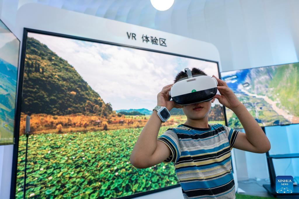 A child tries a VR device at the seventh China-South Asia Expo in Kunming, southwest China's Yunnan Province, Aug. 18, 2023. The ongoing seventh China-South Asia Expo has attracted more than 30,000 exhibitors, representatives, and guests from 85 countries and regions to attend online and offline. (Xinhua/Hu Chao)