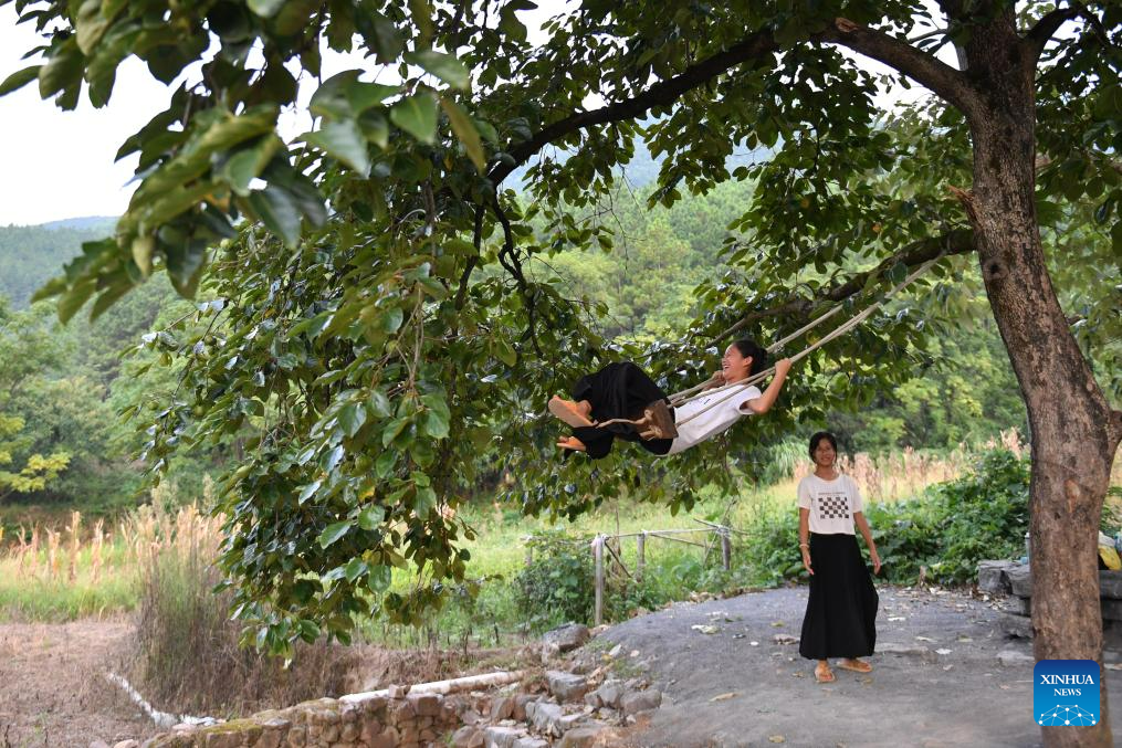 Children play on the swing after dinner in Ningyuan County of central China's Hunan Province, Aug. 19, 2023. (Xinhua/Chen Zhenhai)