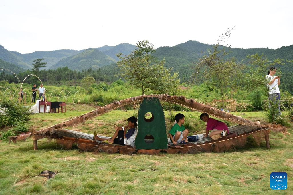 Children play inside an art installation in Ningyuan County of central China's Hunan Province, Aug. 20, 2023. (Xinhua/Chen Zhenhai)