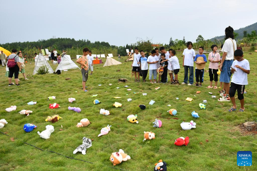 Children play a game of quoits during an art festival in Ningyuan County of central China's Hunan Province, Aug. 20, 2023. (Xinhua/Chen Zhenhai)