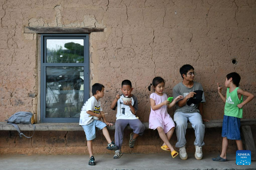 Children interact with a volunteer during dinner in Ningyuan County of central China's Hunan Province, Aug. 19, 2023. (Xinhua/Chen Zhenhai)