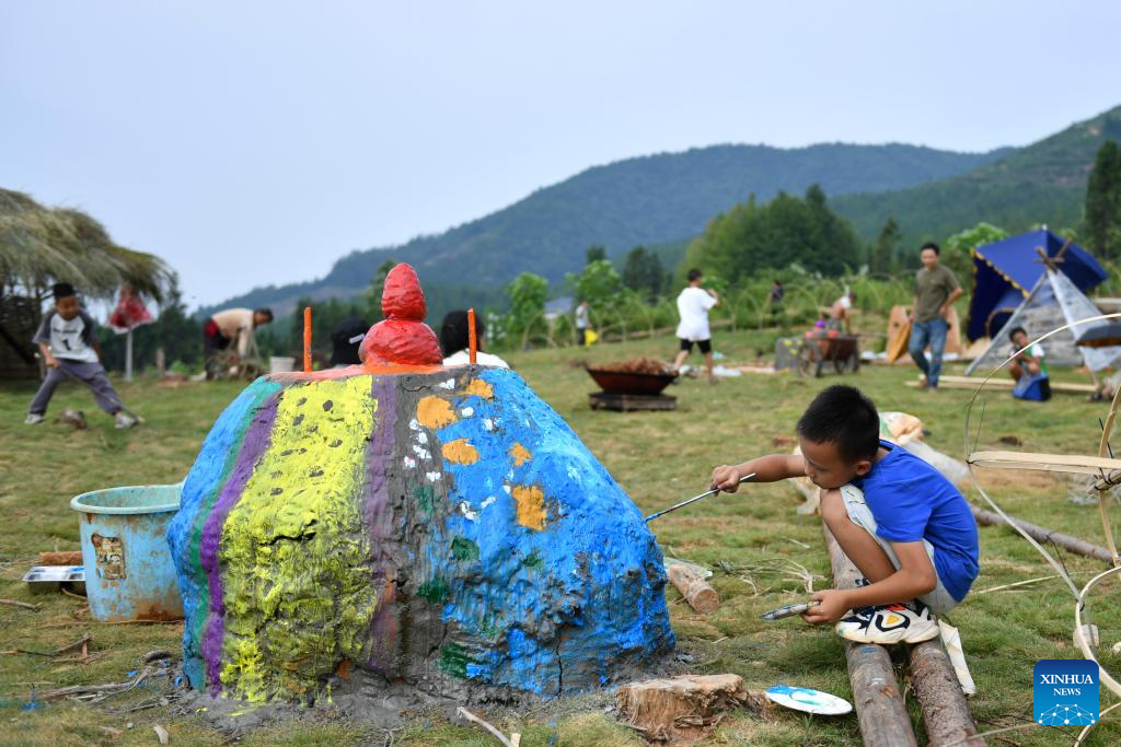 A child paints on a pottery clay installation at an art center in Ningyuan County of central China's Hunan Province, Aug. 19, 2023. (Xinhua/Chen Zhenhai)