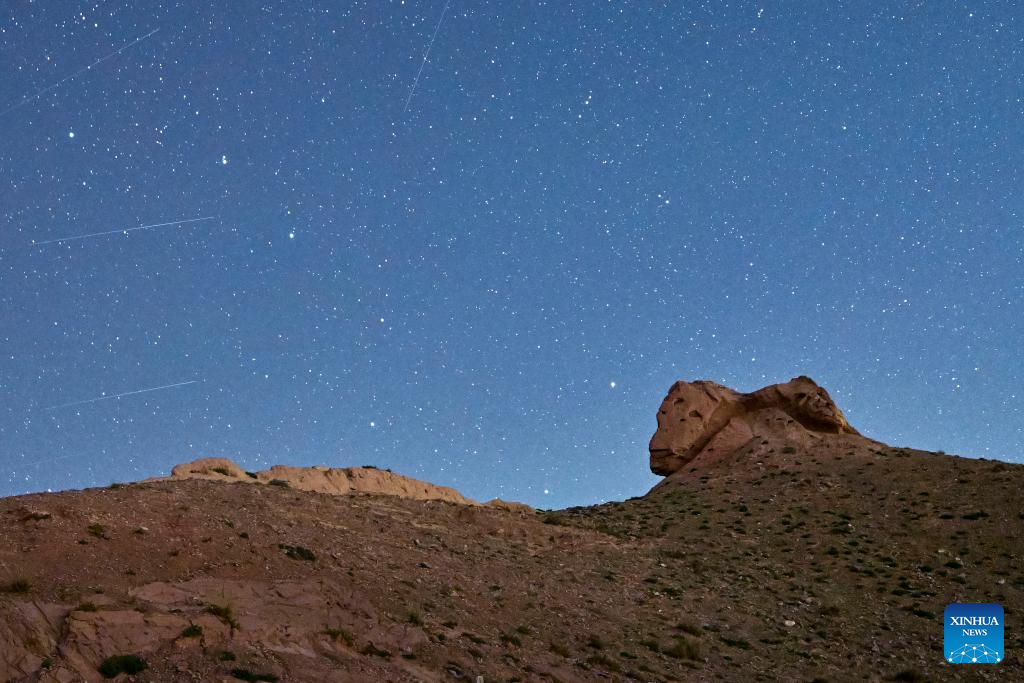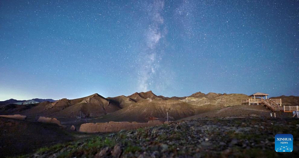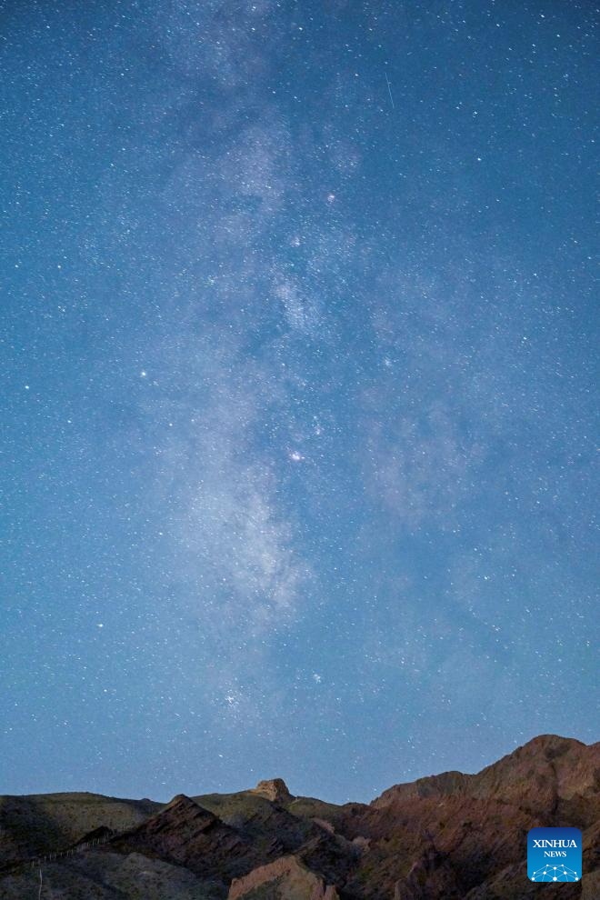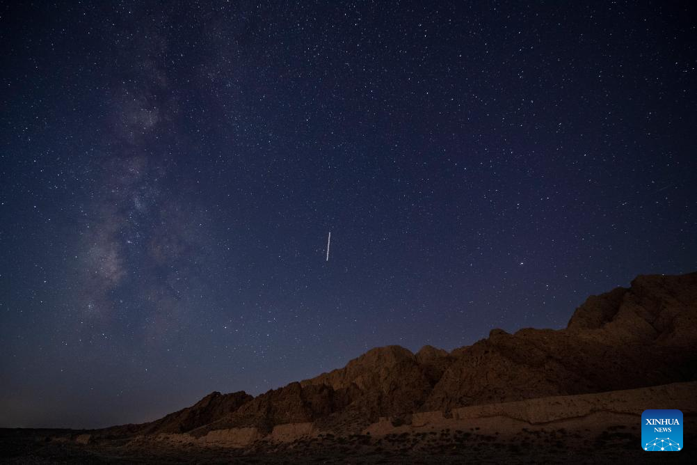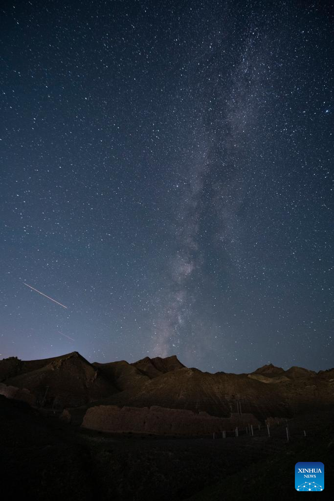 This long-time exposure photo taken on Aug. 20, 2023 shows a section of the Great Wall built in Ming dynasty (1368-1644) under the starry night sky in north China. (Xinhua/Liu Jinhai)