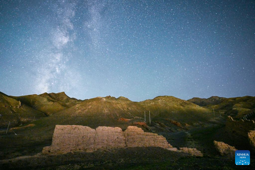 This long-time exposure photo taken on Aug. 21, 2023 shows a section of the Great Wall built in Ming dynasty (1368-1644) under the starry night sky in north China. (Xinhua/Liu Jinhai)