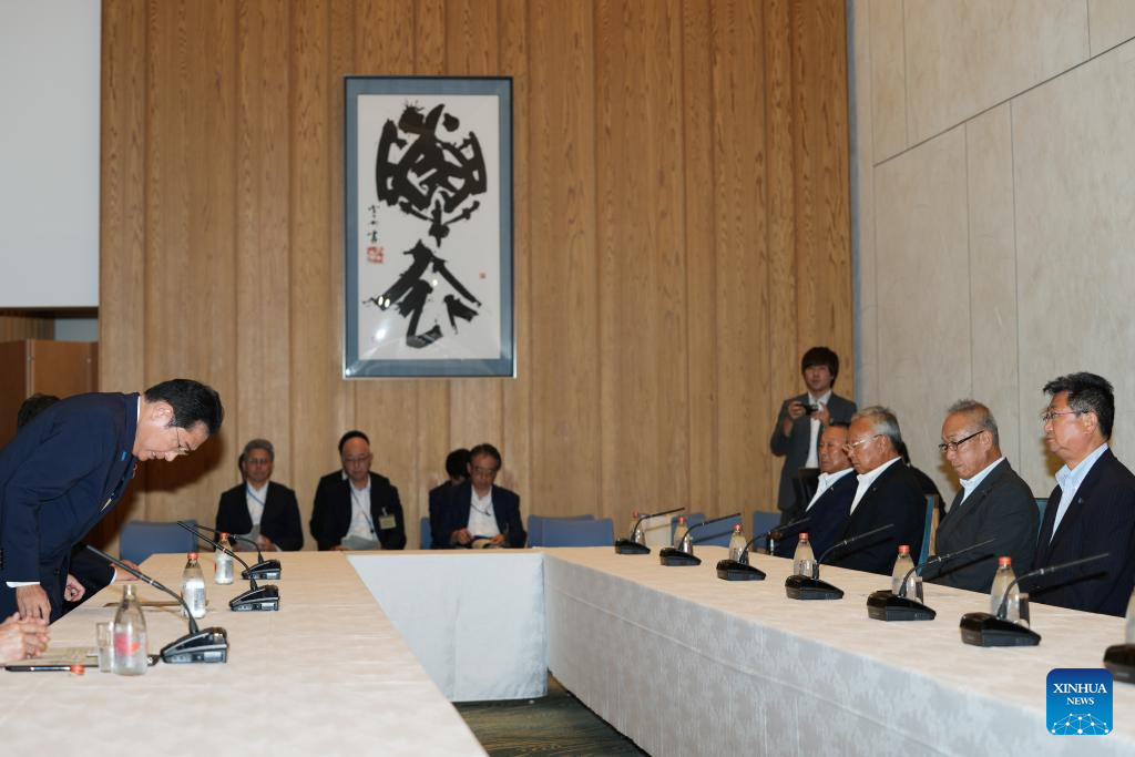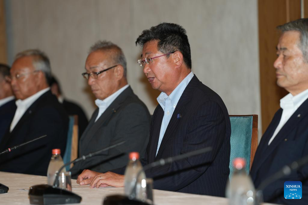 Masanobu Sakamoto (2nd R), head of Japan's National Federation of Fisheries Cooperative Associations, speaks during a meeting with Japanese Prime Minister Fumio Kishida in Tokyo, Japan, Aug. 21, 2023.?(Xinhua/Zhang Xiaoyu)