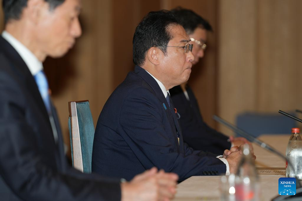 Japanese Prime Minister Fumio Kishida (C) meets with Masanobu Sakamoto, head of Japan's National Federation of Fisheries Cooperative Associations, in Tokyo, Japan, Aug. 21, 2023.?(Xinhua/Zhang Xiaoyu)