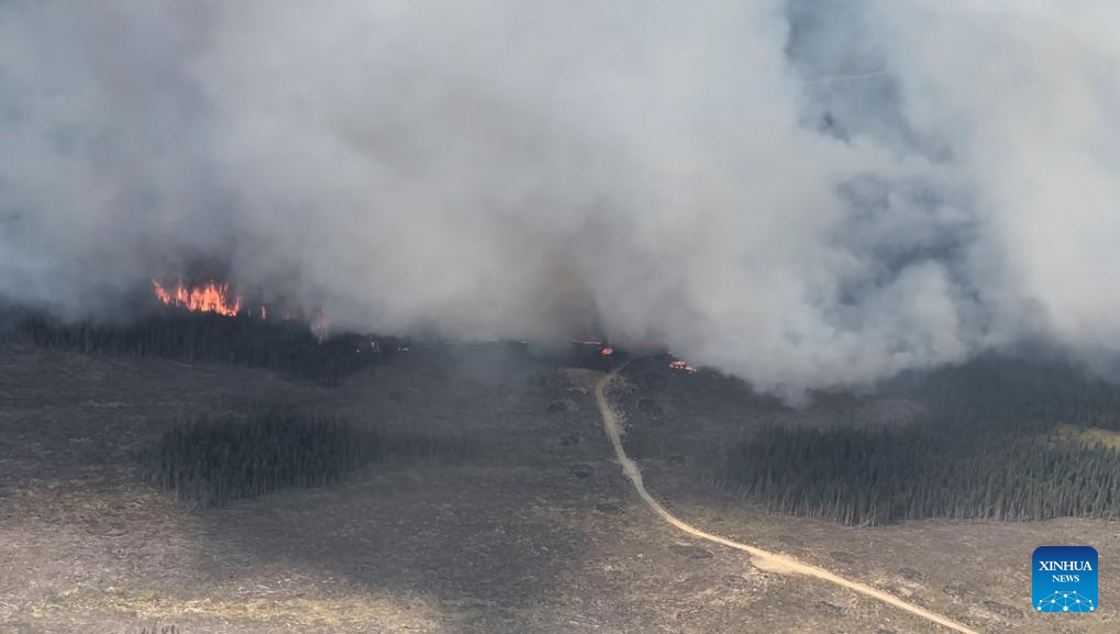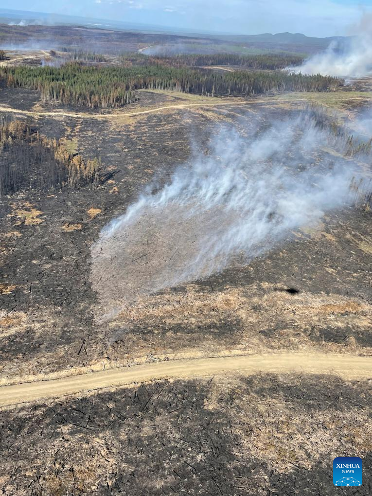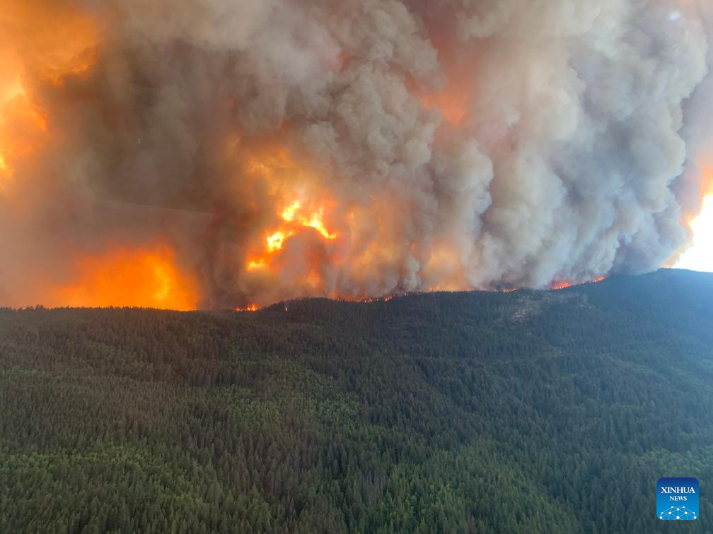 This aerial photo taken on Aug. 15, 2023 shows wildfires near Greer Creek in British Columbia, Canada. Canada is sending the military to tackle the record-breaking wildfires in its British Columbia (BC) province, Canadian Prime Minister Justin Trudeau said Sunday, as local firefighting personnel and resources drained. (BC Wildfire Service/Handout via Xinhua)