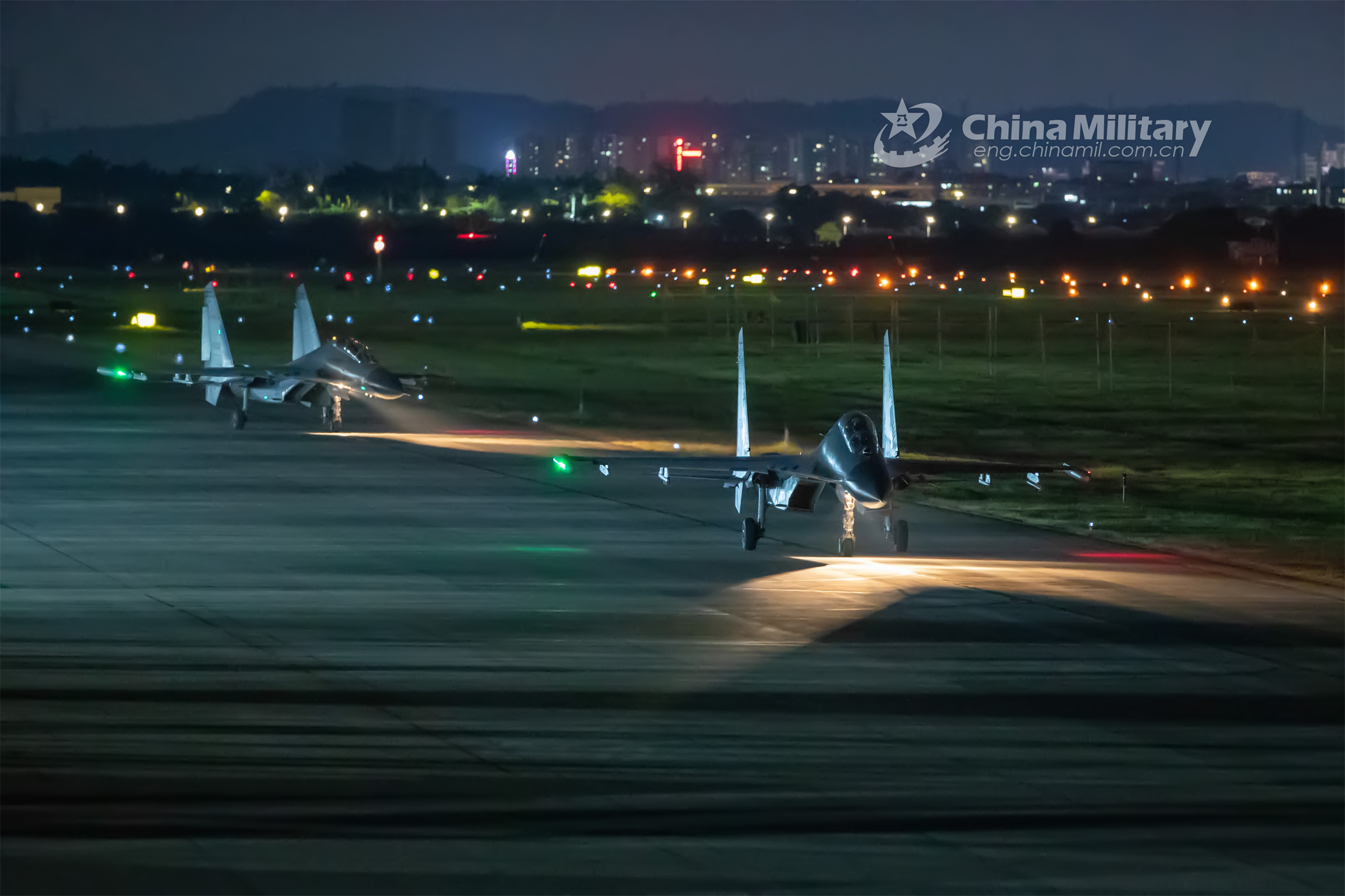 A fighter jet attached to an aviation brigade of the air force under the PLA Southern Theater Command leads another jet towards the runway before takeoff during a recent night flight training exercise. (eng.chinamil.com.cn/Photo by Liu Hang)