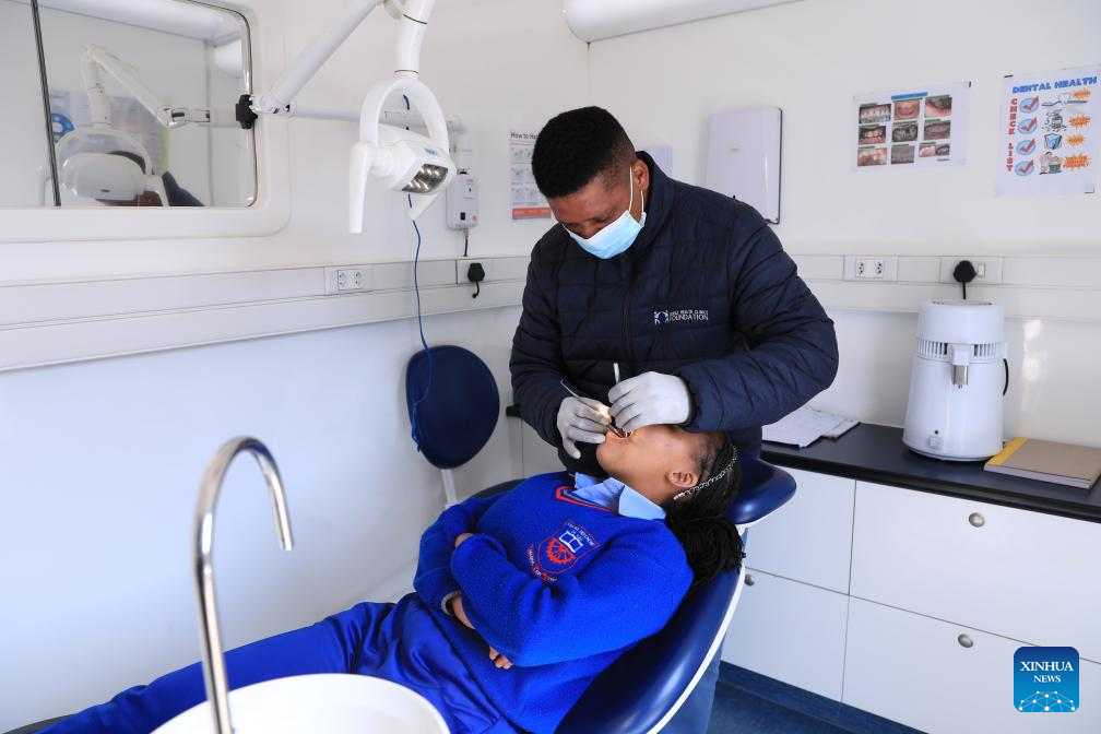 Dental practitioner Teboho Mpotle works on a medical bus purchased by Longyuan SA in De Aar, South Africa, Aug. 10, 2023. (Xinhua/Dong Jianghui)