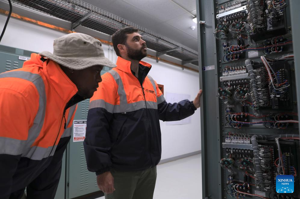Daswin Basson (L) and Regardt van Tonder, deputy manager of a substation of (Longyuan SA) De Aar Wind Power Project, work at the substation in De Aar, South Africa, Aug. 10, 2023. (Xinhua/Dong Jianghui)
