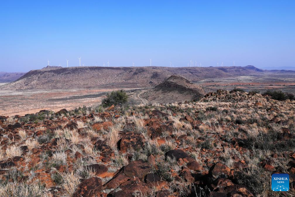 This photo taken on Aug. 10, 2023 shows wind turbines of (Longyuan SA) De Aar Wind Power Project in De Aar, South Africa. (Xinhua/Dong Jianghui)