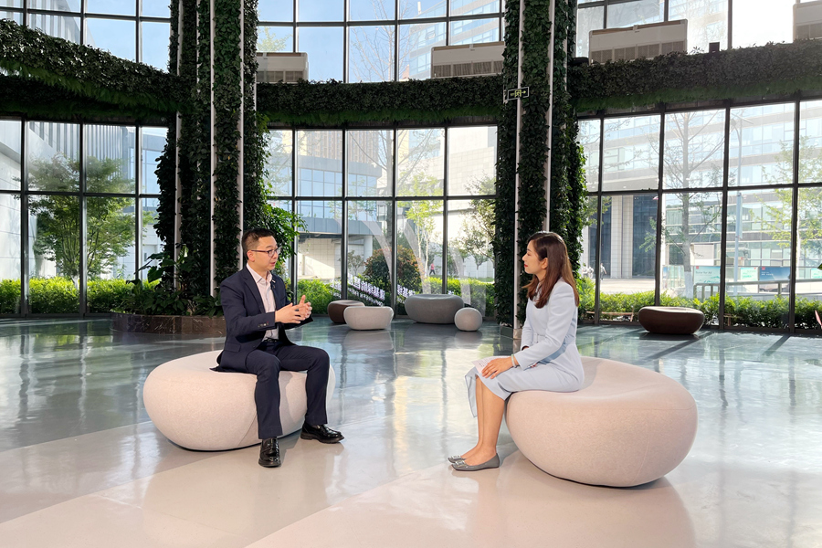 Dennis She (She Haifeng), vice president of LONGi, receives an exclusive interview with People's Daily Online. (People's Daily Online/Huangfu Wanli)