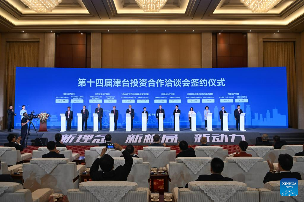 This photo taken on Aug. 22, 2023 shows an agreement signing ceremony during the 14th Tianjin-Taiwan trade fair in north China's Tianjin. The four-day trade fair kicked off in Tianjin on Tuesday. (Xinhua/Sun Fanyue)