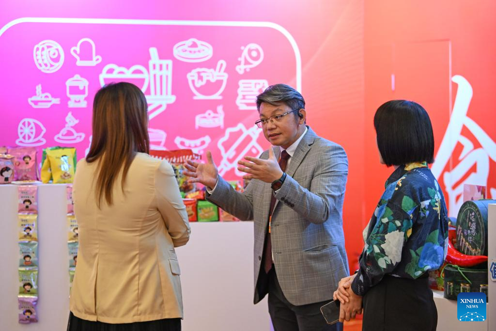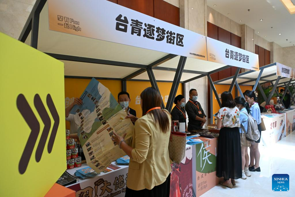 People take part in an event promoting new products for Taiwan enterprises during the 14th Tianjin-Taiwan trade fair in north China's Tianjin, Aug. 22, 2023. The four-day trade fair kicked off in Tianjin on Tuesday. (Xinhua/Sun Fanyue)